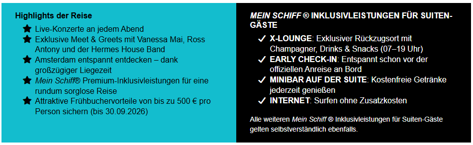 Die beliebte Eventkreuzfahrt startet bereits zum 9. Mal und verbindet Musik, Emotionen und einen unvergesslichen Kurzurlaub auf einzigartige Weise. Für Reisebegeisterte und Musikfans ein absolutes Highlight!